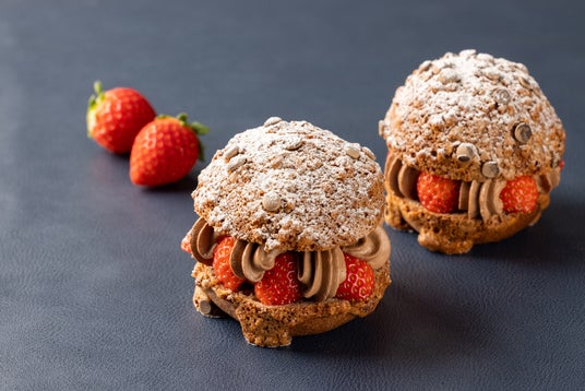 ヘーゼルナッツの自家製クリームを塗って焼きあげた、外はサクサク、中はふわふわのオリジナルのパネトーネ。ホテルオリジナルのチョコレート「Grande H」のチョコレートクリームといちご、なめらかなカスタードクリームのクレーム パティシエールをサンドしました。香り高いカカオの香りが口の中に広がり、いちごの酸味とクレーム パティシエールの甘みのマリアージュを口いっぱいにお楽しみいただける、贅沢な一品です。