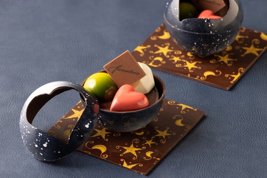 ホテルオリジナルのチョコレート「Grande H」をつかい、ひとつひとつ手作業でつくる宇宙をイメージしたデザインのショコラボールに、ベルガモット、パインココ、ラズベリーのボンボンショコラを忍ばせました。3種のボンボンショコラの下にはラズベリー味のパールチョコレートをふんだんに敷きます。今年は、チョコレートの土台にも宇宙をイメージし、星や月の模様を施し、華やかに仕上げます。