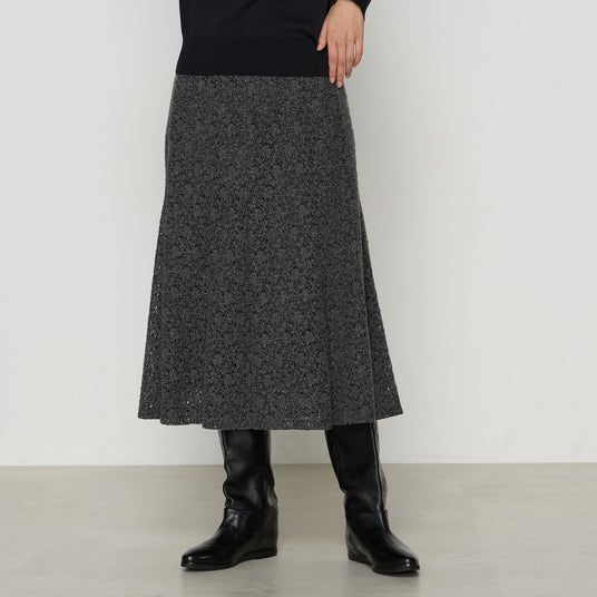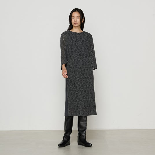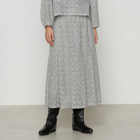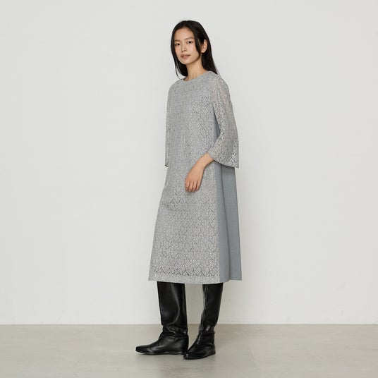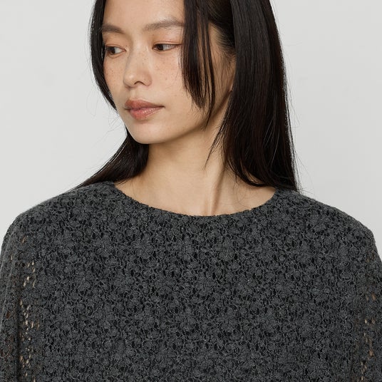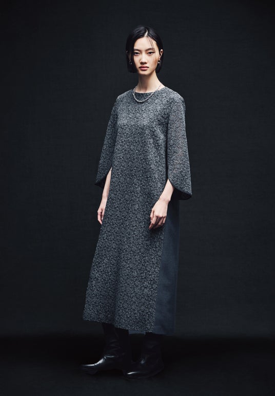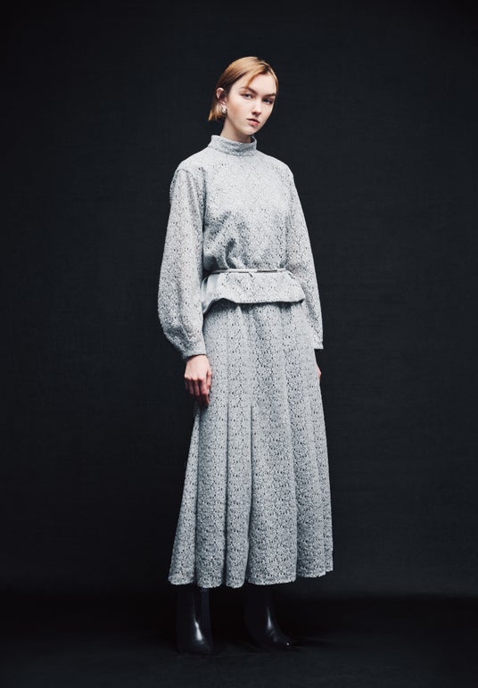全体的に重くなりがちな冬のコーディネートを新鮮にアレンジできるアイテムを作りたいと考え、華やかで、軽やかで、温もりのある風合いに仕上げたブランドオリジナルのウールレースを使い、ドレス、プルオーバー、スカートの3アイテムを作りました。