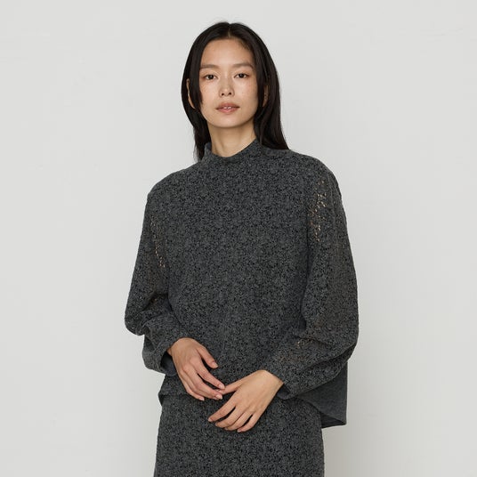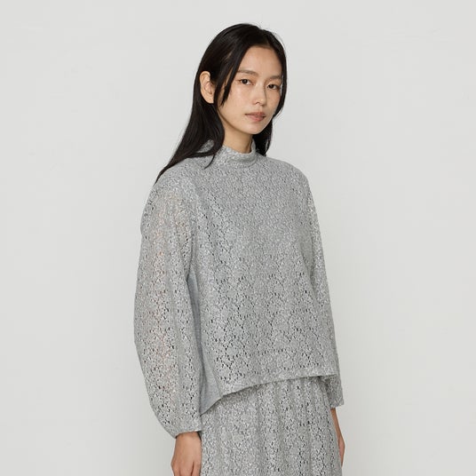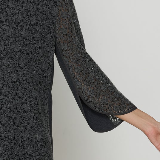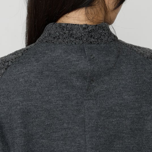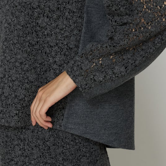 - 前身頃は起毛レース、後ろ身頃は着心地の良いウールジャージーを使用し、レースの華やかさと着心地の良さを両立しました。