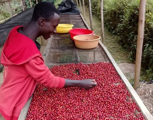 国際審査会で優勝したアフリカのルワンダのコーヒー豆の生産者と単独契約!ルワンダでのコーヒー豆の選別の様子です。