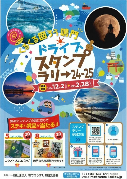 JAF(一般社団法人日本自動車連盟)徳島支部(支部長 北島 義貴)は、2024年12月2日(月)から2025年2月28日(金)まで徳島県鳴門市で開催される「くるくる回ろう 鳴門ドライブスタンプラリー24-25」(主催:一般社団法人鳴門市うずしお観光協会)にドライブスタンプラリーのシステムを提供し、開催に協力します。