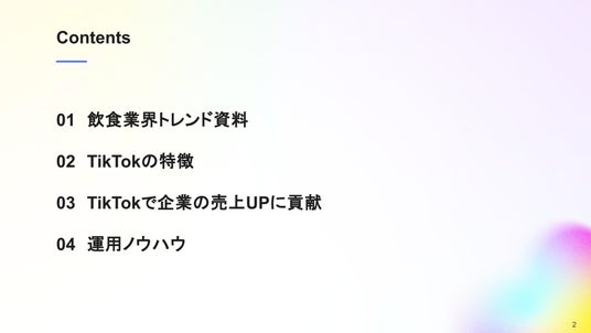 飲食業界がTikTokを効果的に運用するためのノウハウをまとめ、具体的な運用ポイントや効果を最大化するための戦略を提案しています。
