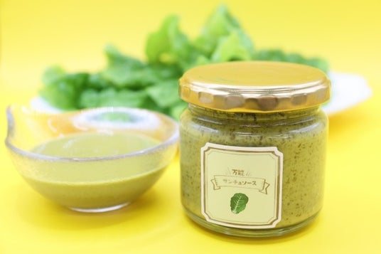 千葉県はサンチュの生産量が日本一です。弊社は、サンチュを水耕栽培で通年栽培しているため自社農園で収穫した新鮮なサンチュをふんだんに使いました。このソースに約20枚のサンチュが入っています。ゴマやピーナツを加えることでコクのある、どなたでも食べやすいソースになりました。風味は、しゃぶしゃぶのゴマだれに似ています。