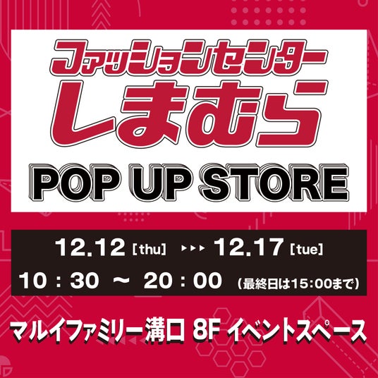 株式会社しまむら(本社所在地:埼玉県さいたま市大宮区北袋町1-602-1、代表取締役:鈴木 誠)は、12月12日(木)よりマルイファミリー溝口にて、POP UP STOREを出店します。「FIBER HEAT(ファイバーヒート)」シリーズの販売やノベルティの配布等、お楽しみいただける内容をご用意しております。ご来店を心よりお待ちしております。
