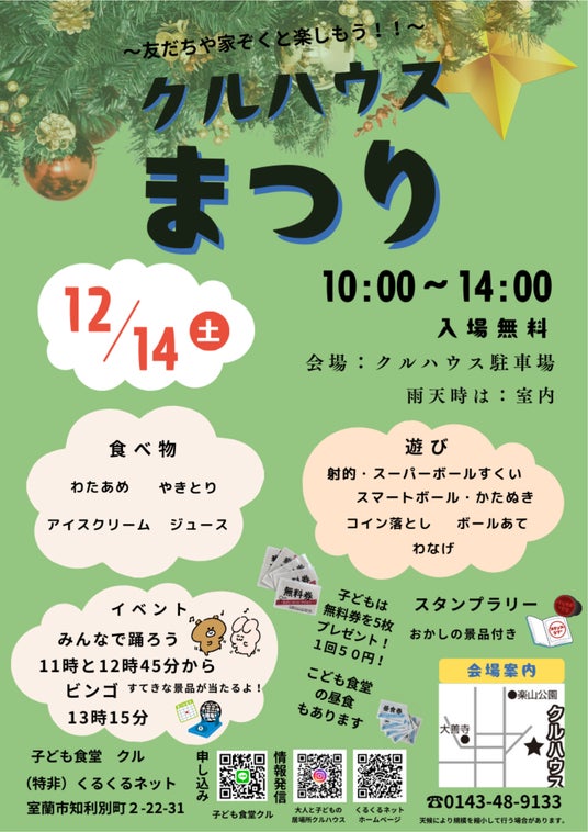 特定非営利活動法人くるくるネットが運営するクルハウスでは、12月14日(土)の午前10時から午後2時まで、恒例の「クルハウスまつり」を開催します。このイベントは、地域住民が気軽に集まり、楽しい時間を共有するために企画されたものです。入場は無料で、どなたでもご参加いただけます。