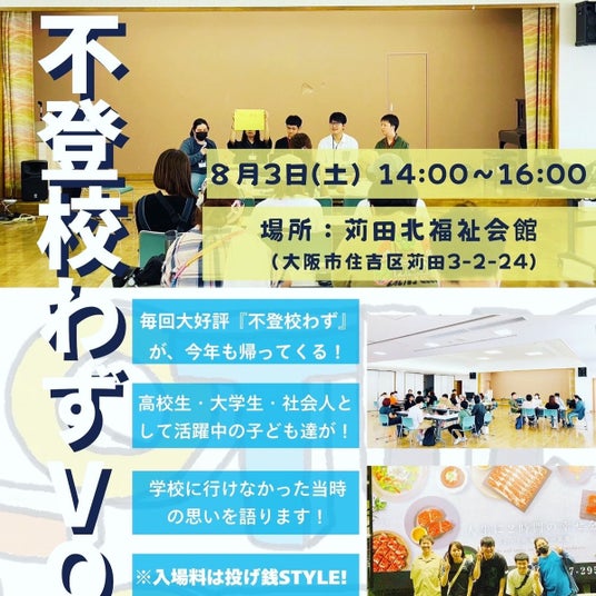 ろーたすのフリースクール卒業生が、『不登校で、悩んでいる子どもと保護者の方に希望を持ってもらいたい』との思いで作ったのが『チーム不登校わず』。vol.3のイベントが大成功に終わった後、メンバーの1人が『こんなに喜んでくれるなら、もっと色んなところで開催したらよくない?』と言ったことがきっかけで、 "47都道府県行脚するぞ!"と決意。全国行脚1発目は、大阪市が共催。