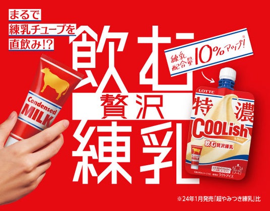 株式会社ロッテは、1月6日(月)に“飲むアイス”の「クーリッシュ」ブランドから、まるで練乳チューブを直飲み!?したような『クーリッシュ 飲む贅沢練乳』を発売します。過去販売した「クーリッシュ」の練乳フレーバー商品も、お客様から大変好評で再販売を希望する声を多くいただいていた中、今回は練乳配合量を10%アップ(※)し、“贅沢”な練乳の味わいを楽しめる商品に進化しました。脂肪分の高い練乳を使用し、冬らしい“特濃”な味わいを、微細氷で後味スッキリ飲める仕立てです。冬の時期でも思わず「クーリッシュ」を飲みたくなる、ギルティ感ある新作クーリッシュをぜひお楽しみください。