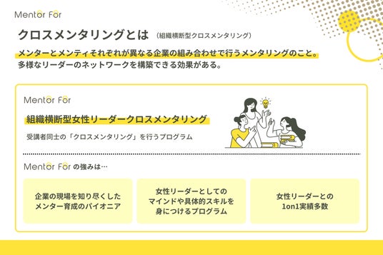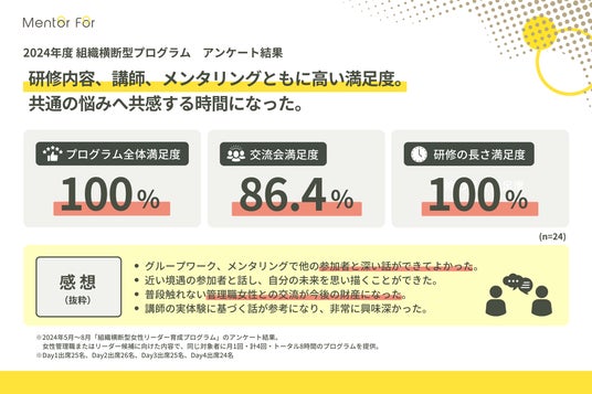 企業のDE&I(Diversity, Equity & Inclusion)・女性活躍推進を目的とした、社外メンターの育成・マッチング・社内メンター制度支援を提供する株式会社Mentor For(東京都渋谷区、代表取締役・池原真佐子、以下Mentor For)は、2024年度に開催した「組織横断型女性リーダー育成プログラム」を発展させた新プログラム「組織横断型女性リーダークロスメンタリング」を、2025年度に開催決定したことをお知らせいたします。