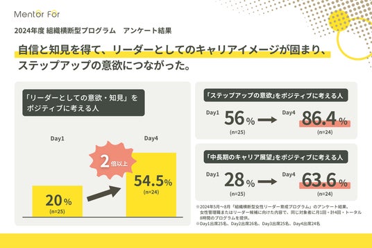 2024年度実施のプログラムでは参加者全員から満足の声、「リーダーとしての意欲・知見」をポジティブに考える人は2倍以上に