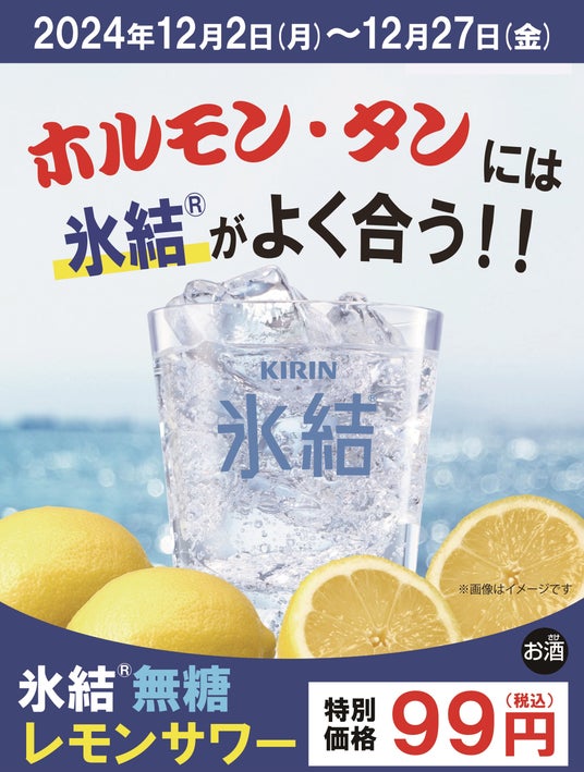 年末は感謝を込めて!!『タンとホルモンが旨い店!焼肉ほるたん屋』氷結無糖レモンサワーが何杯飲んでも税込99円!とってもお得な26日間をお楽しみ下さい‥