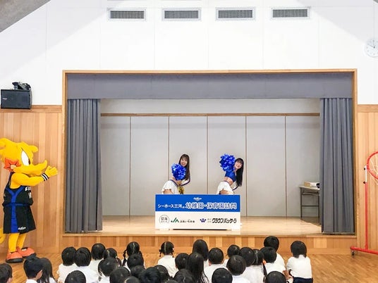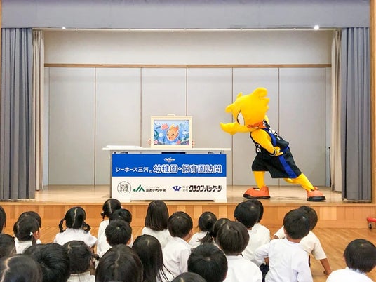 2024年10月28日(月)、シーホースくんとSuper GirlsのYUKI、SAYAKAが桜井こども園(安城市)を訪問し、園児の皆さんと一緒にクイズやダンスを楽しみました。