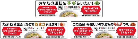 当キャンペーンの広告ステッカーが貼られた車両を撮影し、ハッシュタグ「#かむくらの走るクーポン」と撮影写真を添付した状態でX(旧:Twitter)に投稿された方全員にトッピング無料券(150円までのトッピング)をプレゼント!