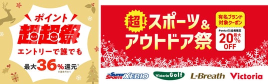 「超!スポーツ&アウトドア祭」では、Super Sports XEBIO やVictoria L-Breath、Victoria Golf、Victoria Surf & Snowの計4店舗の対象商品に利用可能な最大20%割引クーポンをPontaパス会員限定で配布します。そのほか、5%以上のポイント還元や秋冬物からアウトレット品まで対象商品が驚きの価格で通常よりおトクにご購入いただけます。
