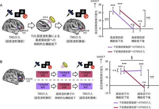 さらに、脳領域間の因果関係を明らかにするため、超音波を用いた経頭蓋超音波刺激(TUS)(*2)と経頭蓋磁気刺激(TMS)(*3)を組み合わせた刺激手法を使用しました。具体的には、脳深部に位置する島皮質前部をTUSで一時的に機能低下させた状態で、下前頭皮質にTMSを適用し、その影響を調べました。その結果、島皮質前部を機能低下させる前には、下前頭皮質へのTMSの効果が確認されましたが、島皮質前部を機能低下させた後は、TMSの効果が見られなくなりました(図2A)。これは、島皮質前部が下前頭皮質の機能に直接的に影響を与えていることを示唆しています。
