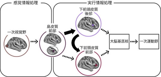 視覚情報の認識から行動の停止まで、一次視覚野-島皮質前部-下前頭皮質(後部・前部)-大脳基底核・一次運動野に至る情報経路が明らかになりました。