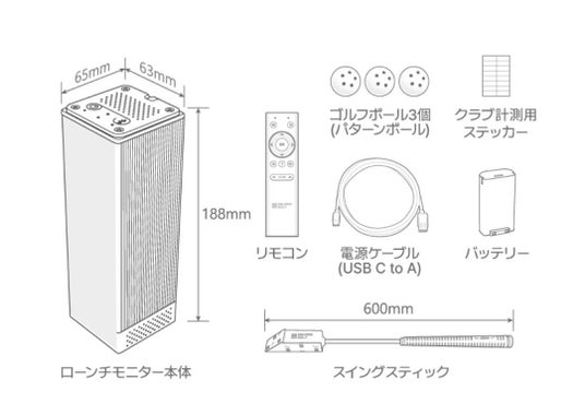 ※セット内容:ローンチモニター、リモコン、ゴルフボール、電源ケーブル、クラブ計測用ステッカー、バッテリー、スイングスティック(計7点)