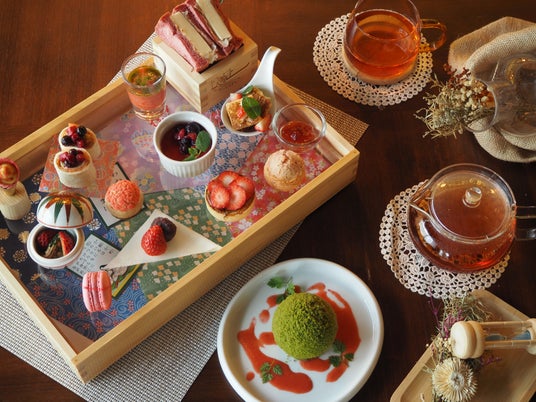 今回のアフタフーンティーよりご提供スタイルを一新し、木の温かみを感じられるティーセットでご提供いたします。ホテルのコンセプト「平安京・貴族の遊び」にちなみ、和紙や和柄の折り紙、レストランの壁面タペストリーにも用いられている百人一首で装飾され、器からもホテルの雰囲気を味わっていただけます。