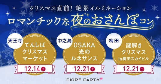 フィオーレパーティーは、クリスマス間近の12月14日(土)・21日(土)の両日、大阪の3か所の人気イルミネーションスポットで、街を散策しながら婚活をするいわゆる「お散歩コン」を開催します。いずれの場所も、イルミネーションだけでなく飲食店が多数出店される人気スポット。そこで自由に散策&飲食をしていただくスタイルなので、話題が尽きることがありません。年代を分けて開催するので、ご自身が気になるイベントにぜひご参加ください。