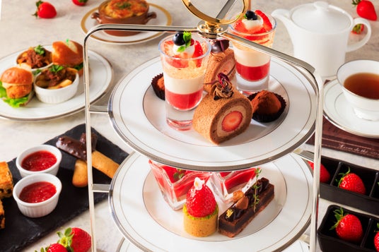 旬の果実を味わうアフタヌーンティーとして、みずみずしく甘酸っぱい苺と、チョコレートをテーマにしたスイーツを2カ月限定でご用意します。苺はすべて国産品を使用するほか、それぞれのメニューに合わせてチョコレートの産地や種類を変えるなど、製菓料理長のこだわりが詰まった品々が、3段のティースタンドに色鮮やかに並びます。