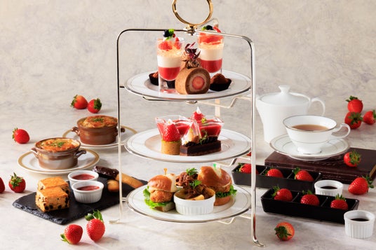 その他にも、製菓料理長が時期ごとに美味しい品種を選んでお届けする「苺の3種食べくらべ」や、毎年好評の「オニオングラタンスープ」など、全12品のスイーツ・セイヴォリーをご用意します。ドイツの老舗紅茶メーカー「ロンネフェルト」の紅茶をはじめとするドリンクメニューとともに、甘酸っぱい旬の果実を楽しむご褒美時間をお楽しみください。