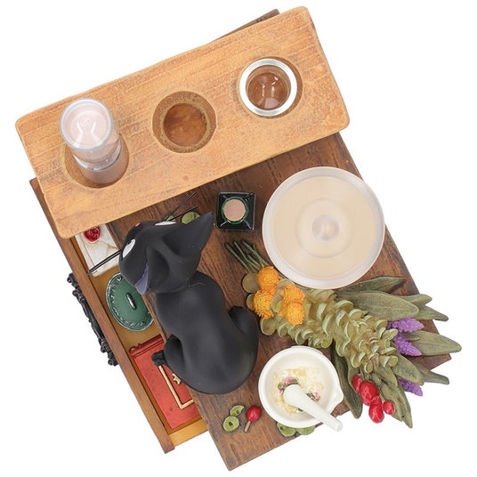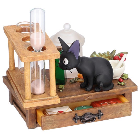 「魔女の宅急便 ジオラマ砂時計 コキリの実験室」は、キキの母コキリが薬を調合している机の上をモチーフにしており、試験管立てに砂時計を立てかけてご使用いただけます。コキリの実験道具やドライフラワーの破片が机の上に散らばっているようすや引き出しの中身など細部まで表現しており、じっと試験管を眺めるジジと一緒に3分を待つほか、付属する一輪挿し用の試験管にお花を挿して楽しむのもおすすめです。