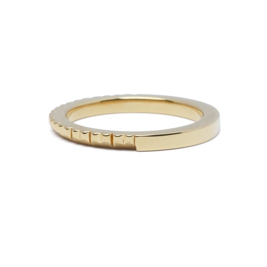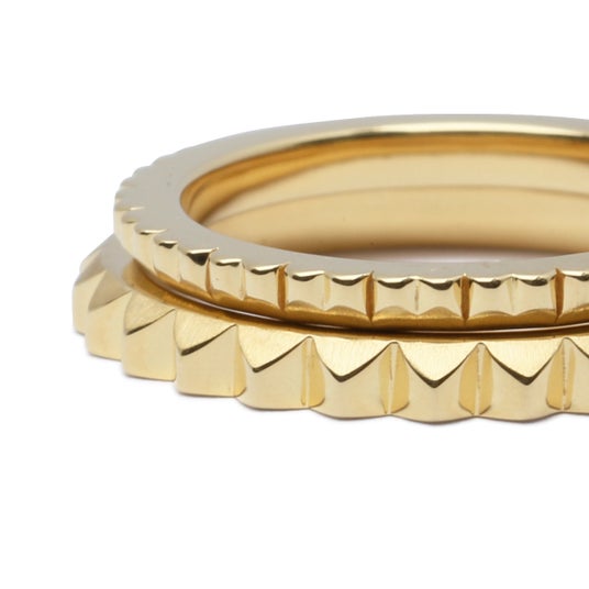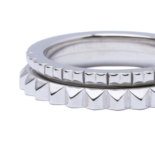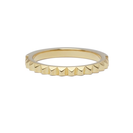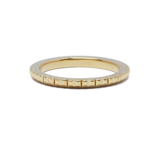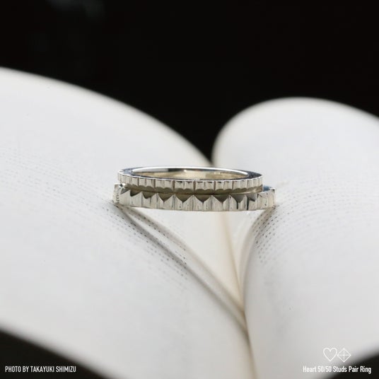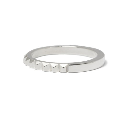ファッションリングとしても人気が高く、スタイルを選ばないスタッズリングをペースに、スタッズの三角カットの反射が、メタルの輝きを拡張させて指元を華やかに彩ります。