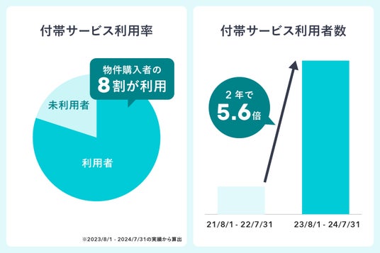 住宅選びと合わせて各種付帯サービスを検討できる利便性に魅力を感じていただき、直近1年(※9)では、「カウカモ」で住宅を購入したお客さまの8割が付帯サービスを利用しています。さらに、付帯サービスの利用者数は、直近2年間で5.6倍に増加(※10)しました。