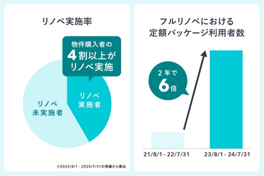 中でも、定額パッケージでフルリノベーションを行うお客さまは、直近2年間で6倍に増加(※8)しました。トレンドに合わせたこだわりの内装を手軽に取り入れられる点や、資金計画が立てやすい点に魅力を感じていただき、ご利用されるお客さまが増加傾向にあります。