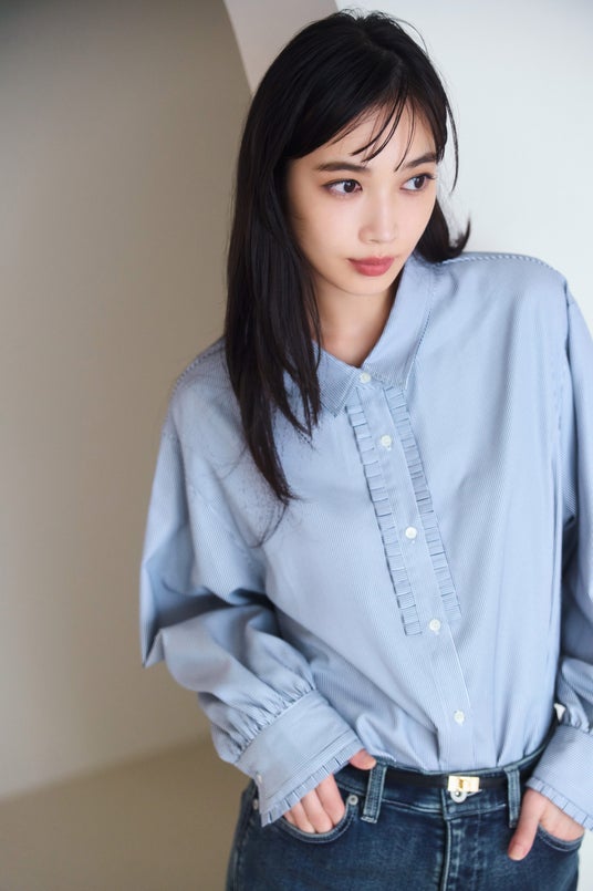 6.フリルシャツをのぞかせてコートスタイルに可愛げを