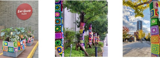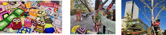 池袋のまちを彩るモチーフをつくるワークショップは、9月~11月にかけて、池袋の公園や近隣のカフェなど8会場で計27回実施されました。その後、講師やスタッフ、ボランティアの方々が完成した編みものアートを木々や建物に飾り付けを実施。編み物を通じて人と人が繋がり、池袋への愛着や地域での交流を深めることができました。