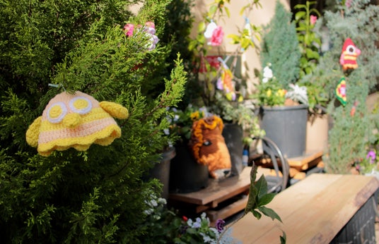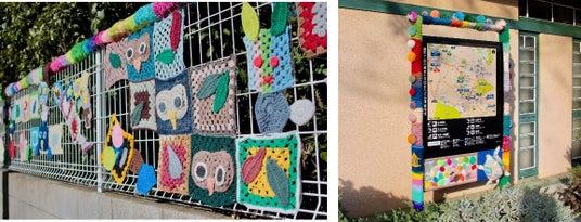 公園内のふくろう像や三角コーンなど様々なものがお花モチーフの編みもので彩られます。編みもの講師が東京建物 Brillia HALL パークプラザなど各地で開催したワークショップで制作されたモチーフを展示。公園内のトイレの柱が編みものでくるまれているのも見どころの一つ。