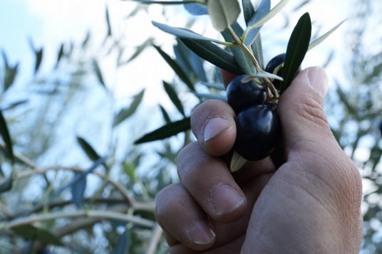 天頂部に実る、極完熟果実(天成りオリーブ)。果実は全て手摘み収穫。