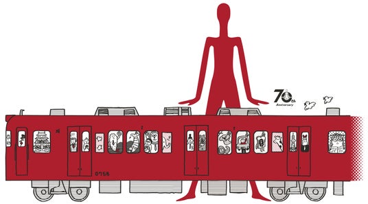 名古屋駅前のシンボルとして愛される名鉄百貨店の広報部員「ナナちゃん」と、名鉄6000系電車をイメージした車両をTシャツのフロントからバックにかけてデザイン。ナナちゃんに見守られて走る電車には名古屋にちなんだユニークな乗客達が乗り込んで、名鉄百貨店の70周年をお祝いしています。よく見ると車体に記された車両番号が「0758(=ナゴヤ)」になっているのもポイント。
