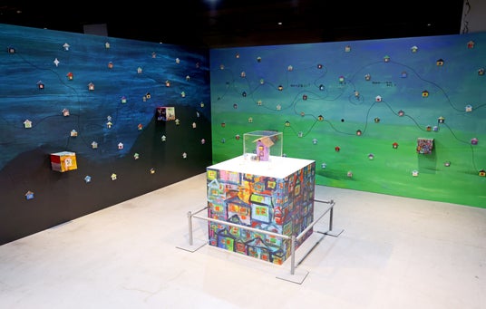 ノリさんのアート“OUCHI”が部屋の四方に広がった空間。屋根などのパーツを組み合わせオリジナルのOUCHI(※)を作り、この未完成なMACHIを発展させよう!