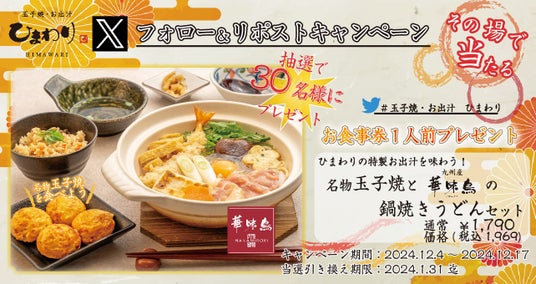 あわせて、その場で30名様に「『名物玉子焼と華味鳥の鍋焼きうどんセット1人前』デジタルお食事券(税込み1,969円相当)」が当たるXキャンペーンを開催中です。今回の「デジタルお食事券」をはじめ、デジタル技術を活用したブランド体験のデジタル化取り組み(DX)を進めております。「玉子焼・お出汁 ひまわり」は、お客様の暮らしを彩り、普段の生活の中で小さな幸せを感じていただけるよう取り組んでまいります。