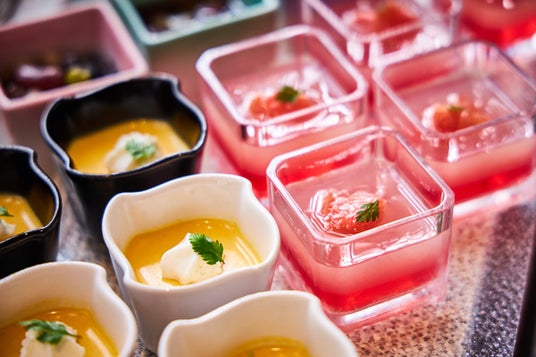 食後のデザートは、鉄板で仕上げる旬香自慢のふわふわな出来立てパンケーキをお席にご用意いたします。また、小菓子、ゼリー、焼き菓子などのパティシエ特製デザートも6種類ビュッフェ台に並びます。食べやすいサイズでお好きなだけお取りいただけますので、心ゆくまでご堪能ください。