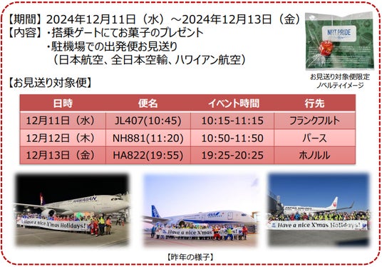 お客様への日頃の感謝の気持ちと、楽しいクリスマスホリデーをお過ごしいただきたいという想いを込めて、日本航空、全日本空輸、ハワイアン航空の3便のお見送りを行います。また、当該便をご利用のお客様には、お見送り対象便限定のお菓子をプレゼントします。