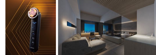 機器と併用する美容液『メソスタイルゲル プレミア』と共に、3室全てに設置するほか、アタッチメントを装着すれば頭皮や顔のリフトケア*⁵もでき、速乾美髪を叶える、ヤーマン最上位モデル*⁶のヘアドライヤー『ヴェーダリフトドライヤー』と使うたび髪質の変化を実感するヘアアイロン『ヴェーダスムースアイロン BS for Salon』、高出力*⁷LEDで極上美肌*⁸を叶える美顔器スチーマー『フォトケア プラス』も客室内に設置いたします。エグゼクティブフロアのスイート・ジュニアスイートから夜景を眺めながら、ゆっくりとお肌と髪のケアをしていただき、贅沢なご滞在時間を満喫していただけます。
