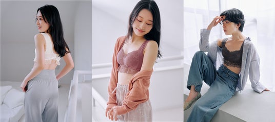 寝ている間も快適な着け心地はそのままに、肩紐やレースを短縮したり、アンダー65サイズまでのところ、新たにアンダー60サイズをご用意し、より小柄女性に寄り添うアイテムにアップデート。定番のアイボリー、チャコールに加えて、秋冬にぴったりな限定カラーのティントピンクをご用意いたしました。