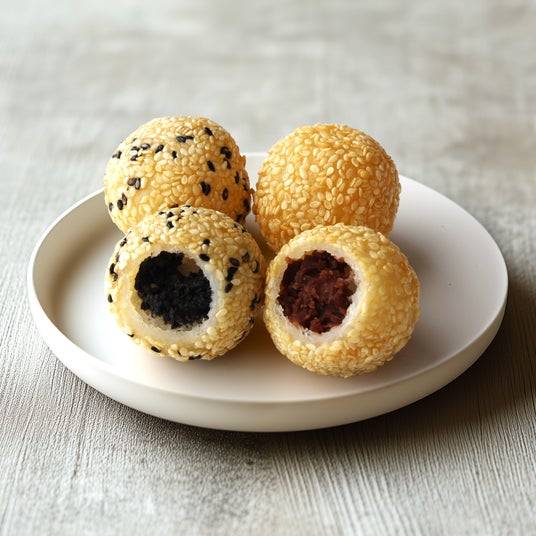外はカリっと中はモチっとした皮に包まれた、濃厚なごま餡とこし餡が入った団子。1串で2種類のごま団子が楽しめます。