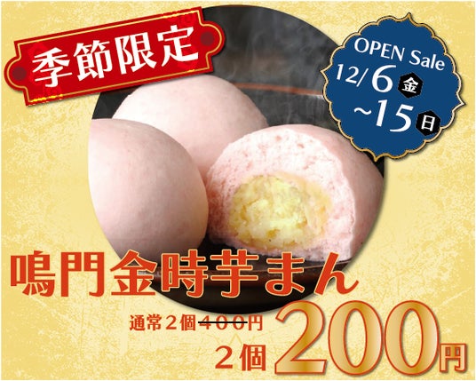 12月6日(金)~15日(日)の10日間、季節限定メニュー「鳴門金時芋まん」を2個200円(通常2個400円)で販売いたします。