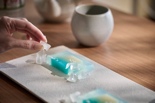 冬の葉山を感じていただける優しい甘さのスイーツと富士の天然水で淹れたお茶がお出迎え。澄んだ冬空に美しく浮かび上がる葉山富士をイメージした、蜜柑が香る「錦玉羹」と自家製の葉山塩と塩麹を使用した「琥珀糖」をご用意。お茶は葉山にある「日の出園」より、クセが無くほのかな甘みで飲みやすい煎茶「知覧茶」。
