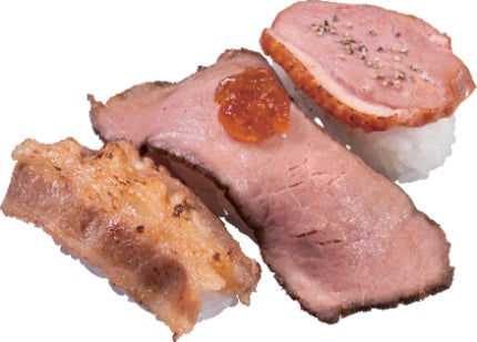 『九州産黒毛和牛炙り ~黒樺牛A5ランク使用~』や『合鴨ロースペッパー』に加え、かっぱ寿司の人気商品『牛カルビ炙り』の3種類の炙り肉ネタ寿司を食べ比べできる一皿です。