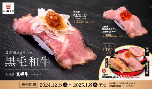 コロワイドグループのかっぱ寿司(カッパ・クリエイト(株) 本社:神奈川県横浜市、代表取締役社長:山角豪)は、2024年12月5日(木)~2025年1月8日(水)予定※1の期間、九州産黒毛和牛「黒樺牛(くろはなぎゅう)」を使用した本格肉ネタ寿司を販売いたします。