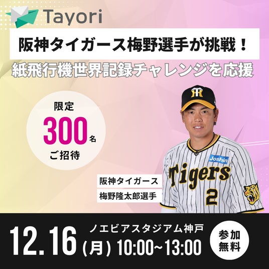 <限定300名>阪神タイガース梅野選手がTayoriと挑戦!紙飛行機世界記録チャレンジへご招待