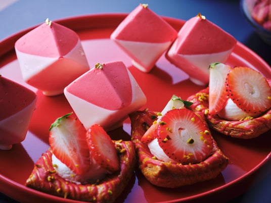 ストロベリームースとコンポ―ト(上) ストロベリーとリコッタチーズのパイ、バルサミコチョコレート(下)