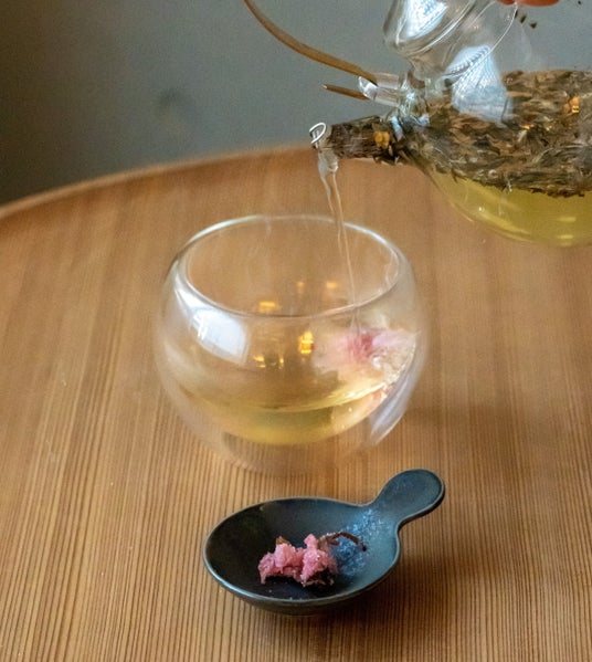 桜田さんコメント:心と体をほっと温めてくれる枇杷のお茶。自分でお茶を注ぐ楽しさと、桜の花がふわっと広がる美しさをお楽しみください。春の訪れを一足先に感じさせてくれる、特別なティータイムをぜひどうぞ!