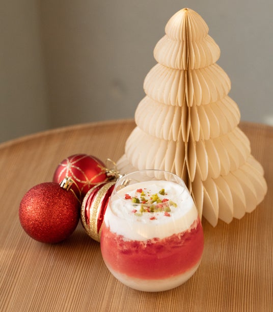 スノードーム・イン・ザ・スペースルイボスティーとクランベリーをベースにした中央の赤いドリンクをヨーグルトとクリームで挟んだ複層的なドリンクです。