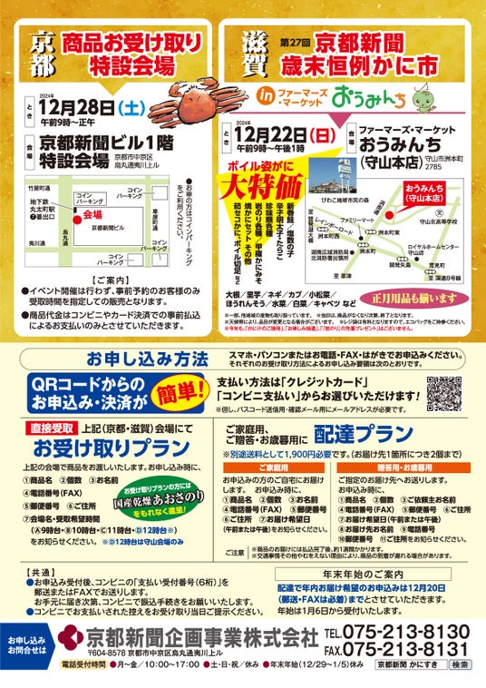 なお、滋賀会場では同日、「第17回京都新聞歳末恒例かに市」を開催します。ボイル姿ガニのほか、新巻きザケや数の子、ダイコンやサトイモなど正月食品も販売しますので、